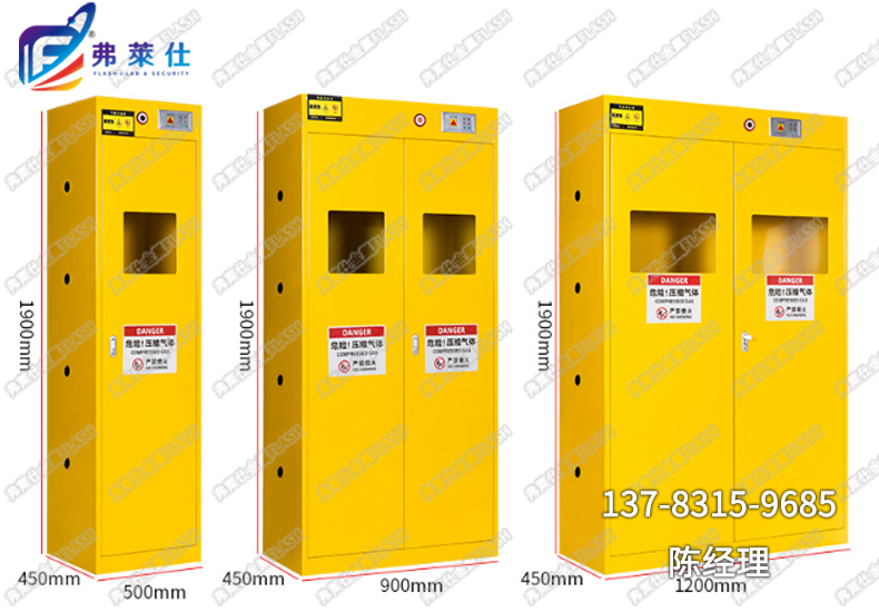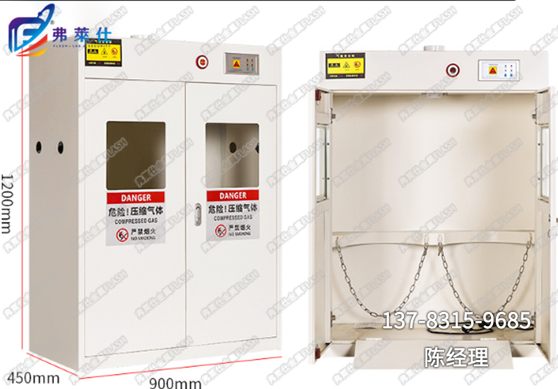 4)內(nèi)置雙不銹鋼卡圈(套鎖式)以固定氣瓶,翻推式墊板方便氣瓶推入;內(nèi)設(shè)排風(fēng)口,便于泄漏的氣體排出,整體外形設(shè)計(jì)美觀大方;配有燃?xì)庑孤﹫?bào)警裝置,適合各種氣體氣瓶的存放。