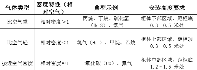 氣瓶柜報(bào)警器的安裝位置需嚴(yán)格匹配氣體密度特性,同時(shí)結(jié)合柜體結(jié)構(gòu)、通風(fēng)條件及安全預(yù)警需求,核心要求可按氣體類型分類明確。