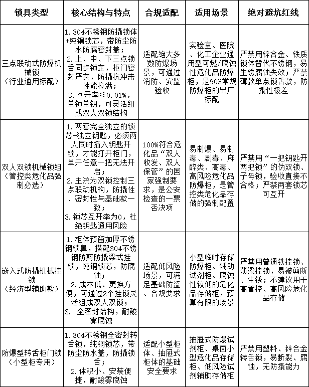 ?;贩辣矜i具的核心選型原則是:合規(guī)優(yōu)先、防爆適配、分級(jí)管控、防撬防盜。其中易制爆、易制毒、劇毒、麻醉類危化品,強(qiáng)制要求雙人雙鎖,這是公安、安監(jiān)、消防、院感檢查的必查紅線。