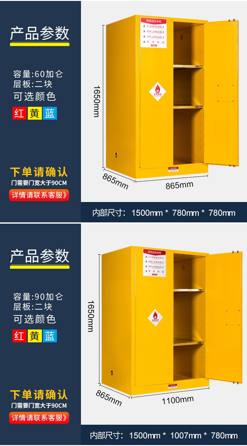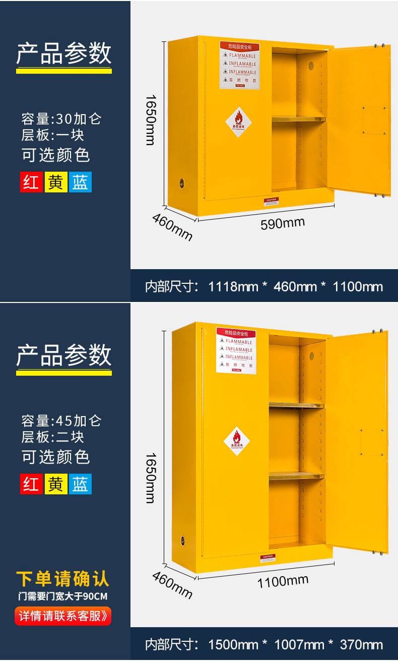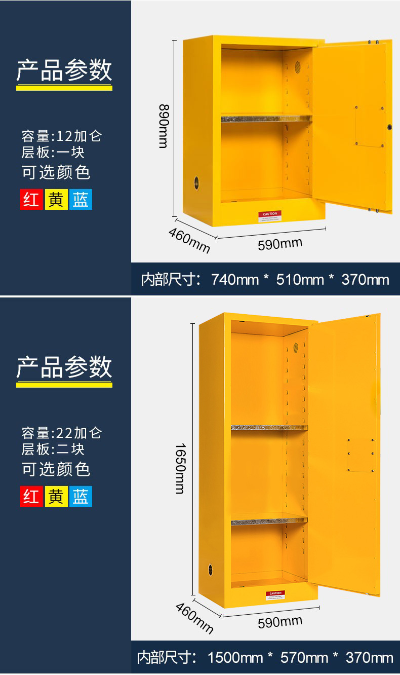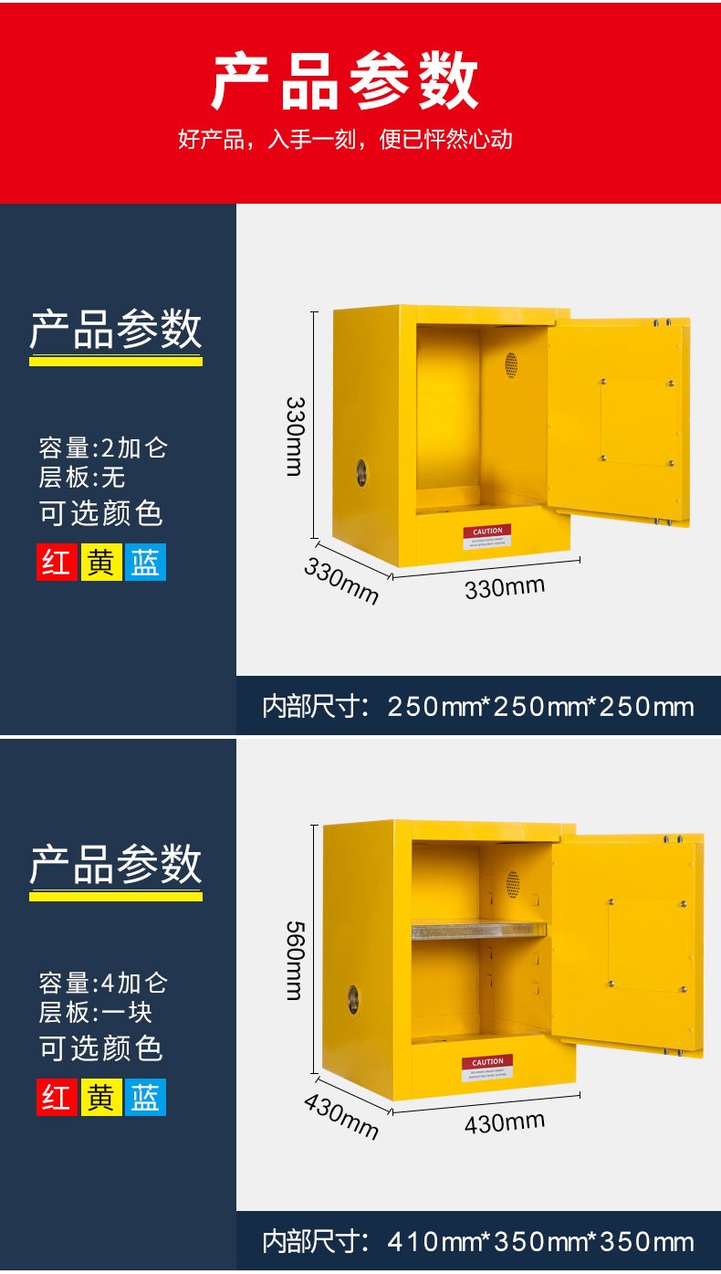 顏色:紅色 黃色 藍(lán)色 規(guī)格:2加侖/4加侖/12加侖/22加侖/30加侖/45加侖/60加侖/90加侖/110加侖 用途:優(yōu)質(zhì)冷軋鋼板雙層防火結(jié)構(gòu),可儲(chǔ)存:滅火器,油氣罐,油桶,油漆,化學(xué)品等
