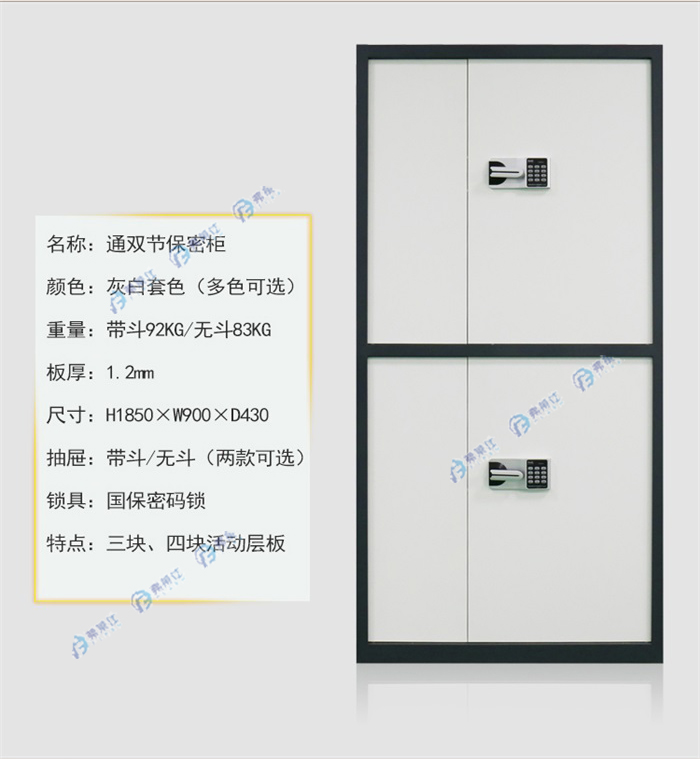 顏色:灰白套色 規(guī)格:H1850xW900xD430mm 用途:適合儲(chǔ)放各種貴重物品:重要檔案,珍貴財(cái)物,公司印章,貴重器材等。