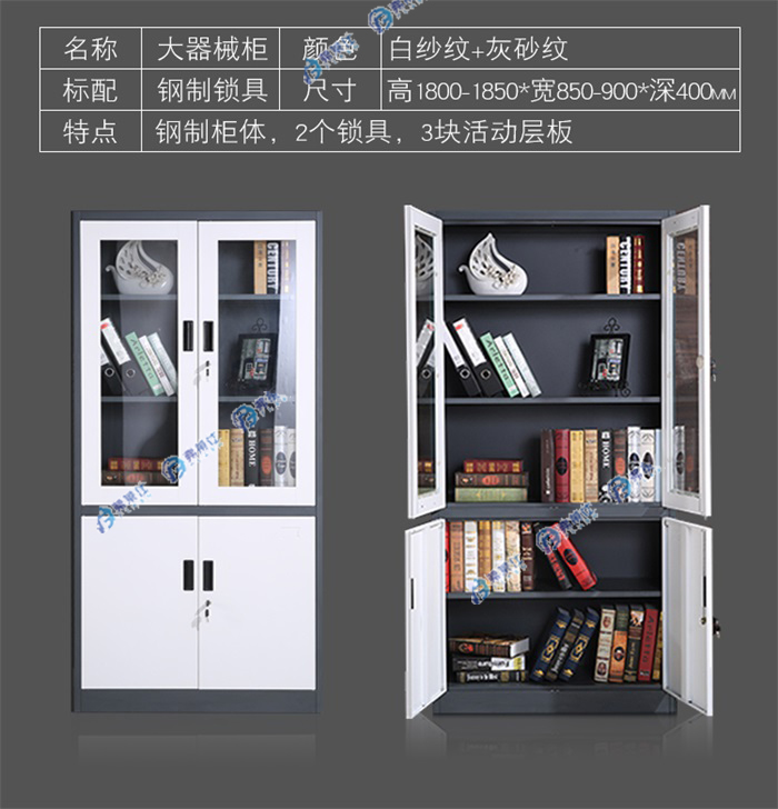 顏色:白紗紋+灰紗紋 規(guī)格:高1800-1850*寬850-900*深400mm 用途:鋼制柜體,2個(gè)鎖具,3塊活動(dòng)層板,廣泛適用于各種場(chǎng)所。