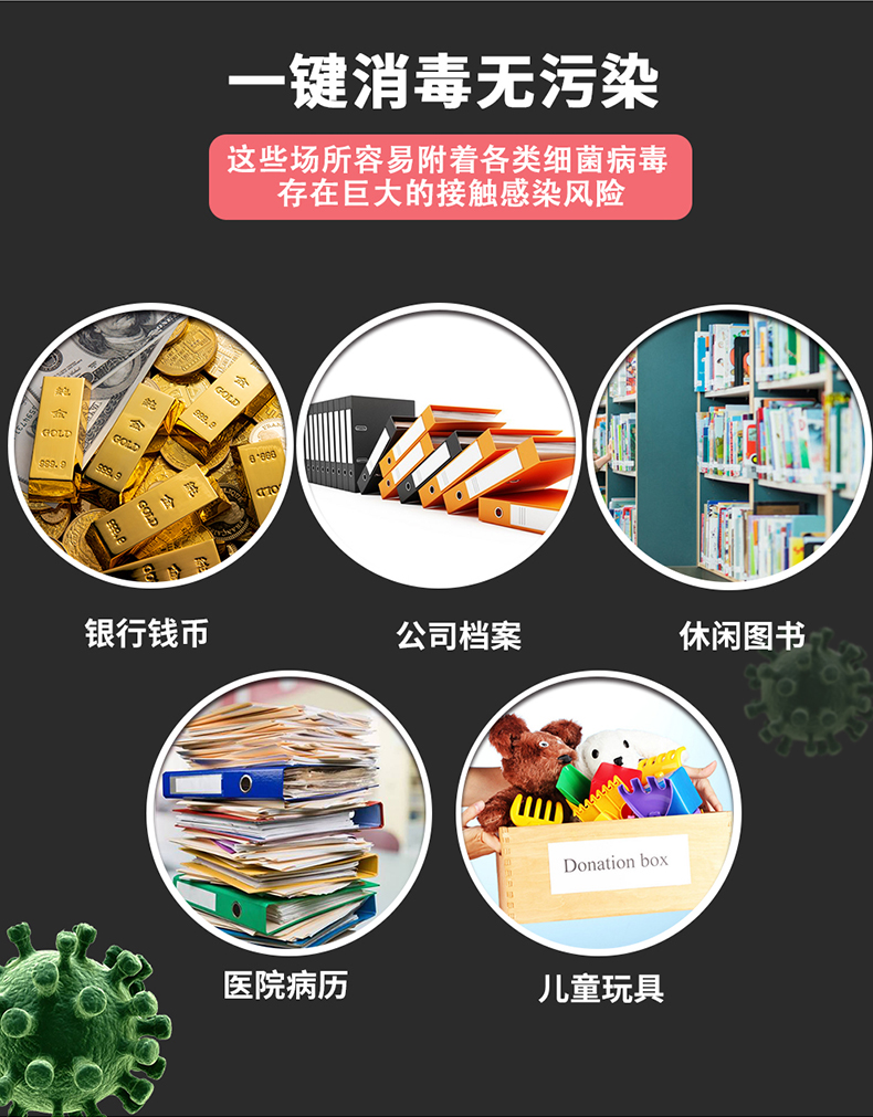 顏色:如圖色 規(guī)格:包裝尺寸 用途:主要用于公司檔案、銀行錢幣、圖書、醫(yī)院病歷、兒童玩具等的消毒